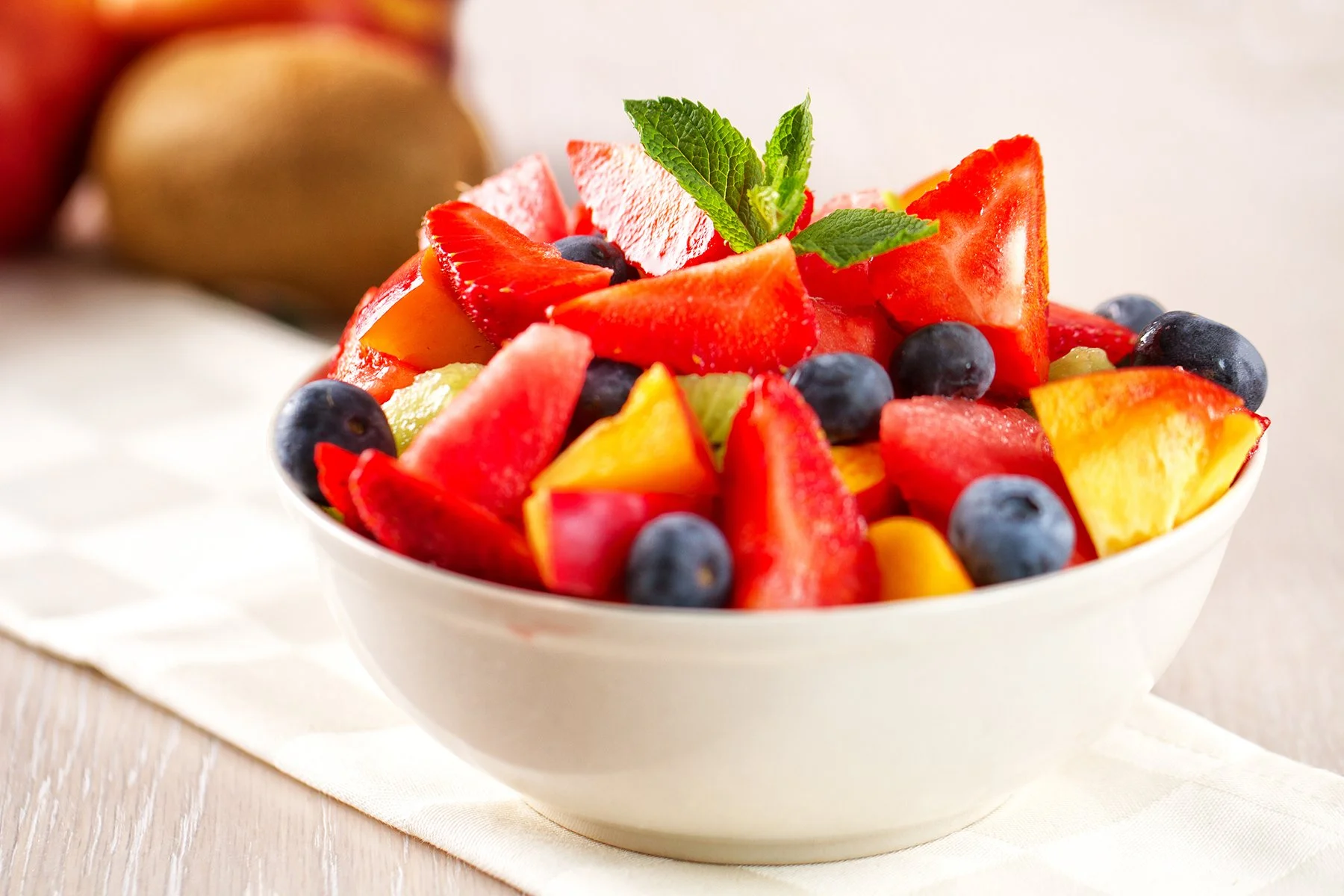 Coloque los duraznos, las fresas, las frambuesas y los arándanos en un tazón grande. Espolvoree la menta fresca por arriba.